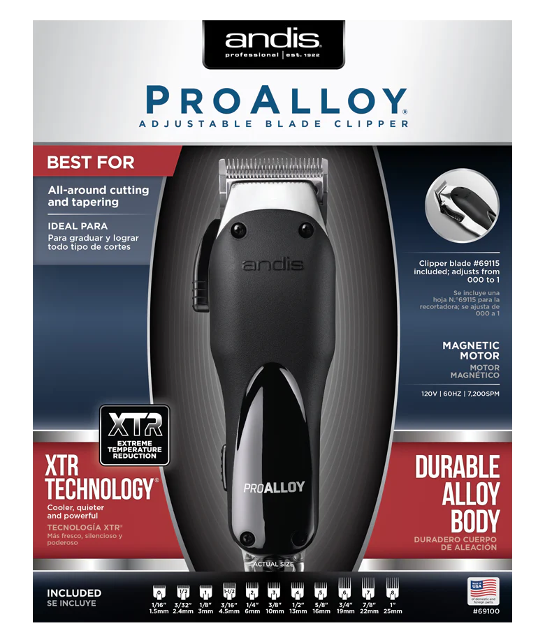 The ANDIS Pro Alloy Clipper with Reduce Temp (Model #AN-69100) is a high-performance grooming tool designed for professional barbers and stylists. Featuring innovative temperature reduction technology, this clipper ensures a cooler, more comfortable experience during extended use, preventing overheating and providing consistent power. The durable alloy housing offers a lightweight, ergonomic design for easy handling, while the powerful motor delivers fast, precise cuts on all hair types. With its sleek, modern design and advanced functionality, the ANDIS Pro Alloy Clipper is the perfect tool for achieving flawless results every time.