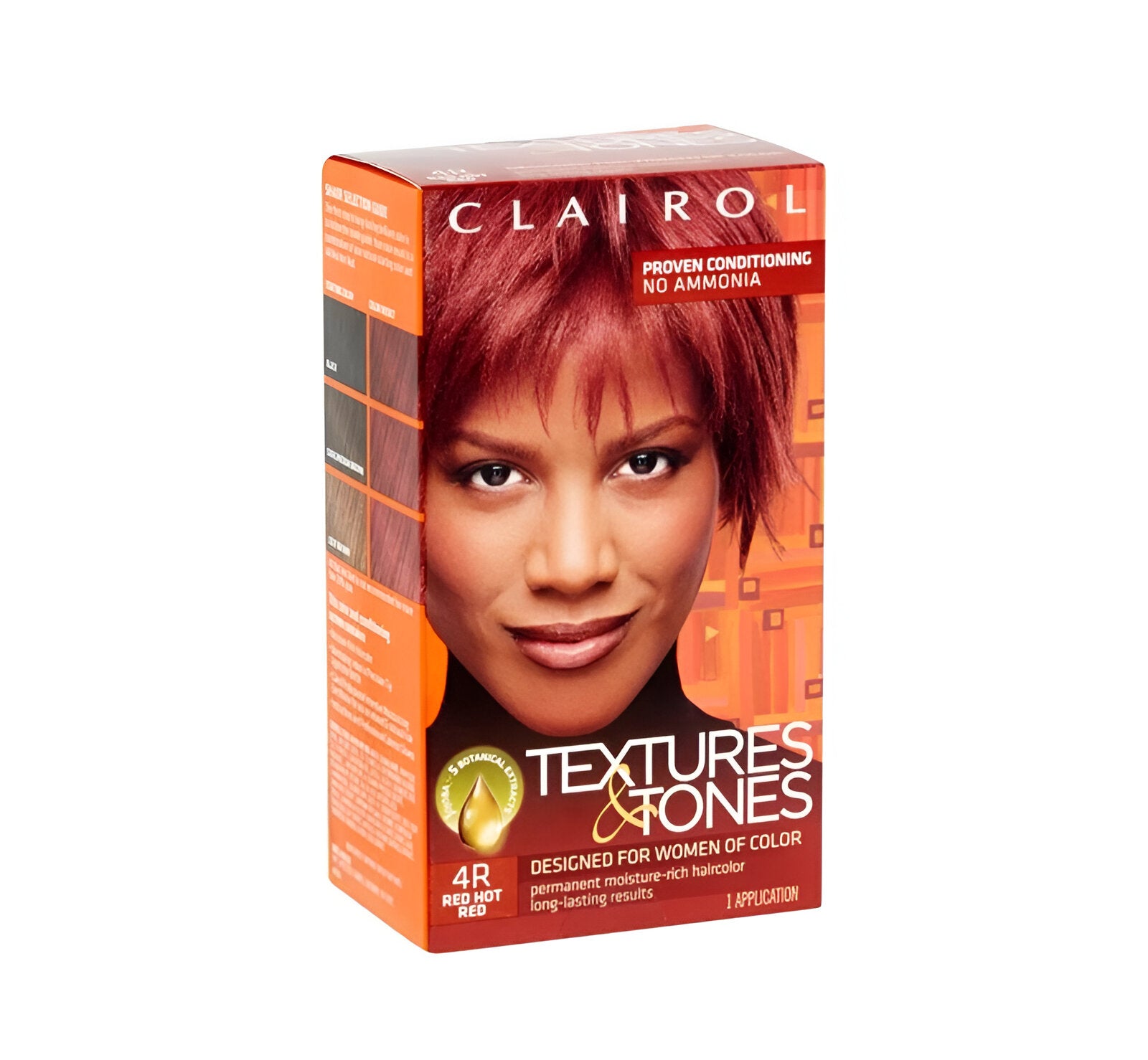 Achieve vibrant, long-lasting color with the Clairol Textures & Tones Permanent Hair Color Kit in 4R Red Hot Red. This rich, fiery shade delivers a bold red hue that enhances your natural beauty, leaving your hair radiant and full of life. Specially formulated for textured and curly hair, it nourishes while coloring, providing deep moisture and shine. The unique blend of ingredients helps to maintain the health of your hair while ensuring even color coverage from root to tip. Perfect for those seeking a striking red shade with a smooth, glossy finish.