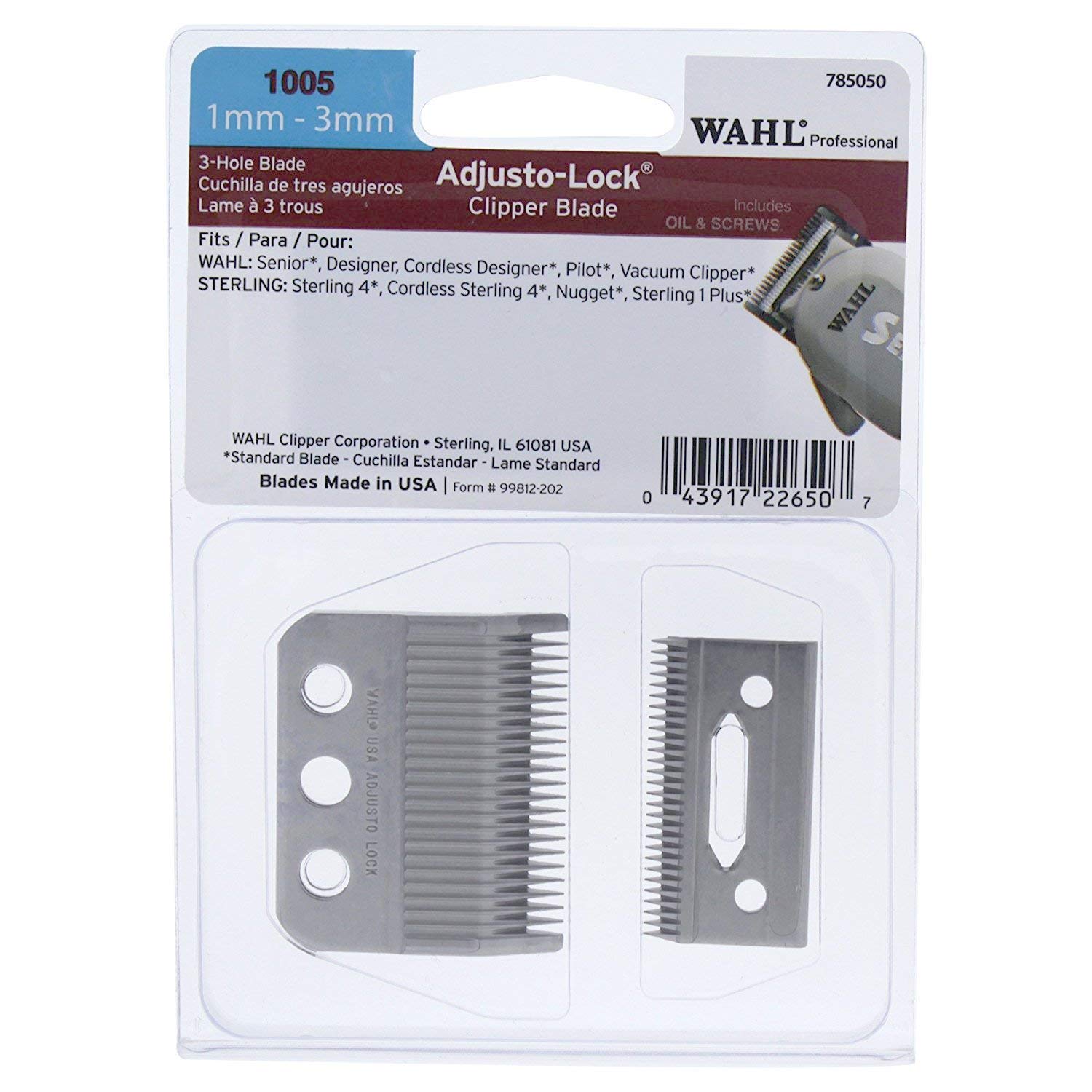 • PRODUCT SPECIFICATIONS: Package contains 1 Wahl Professional 3 Hole Adjusto-Lock (1mm - 3mm) Clipper Blade; Silver in color, includes blade oil, screws, and instructions; Blades made in the U.S.A., Intended for professional use only.