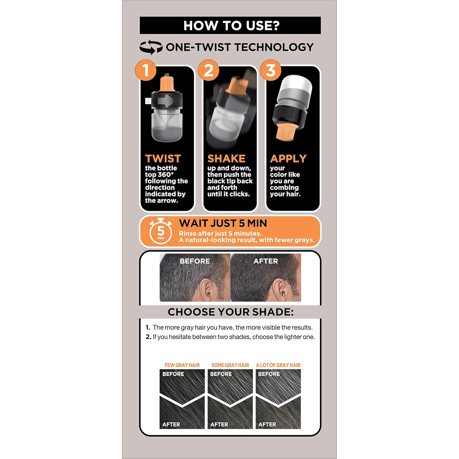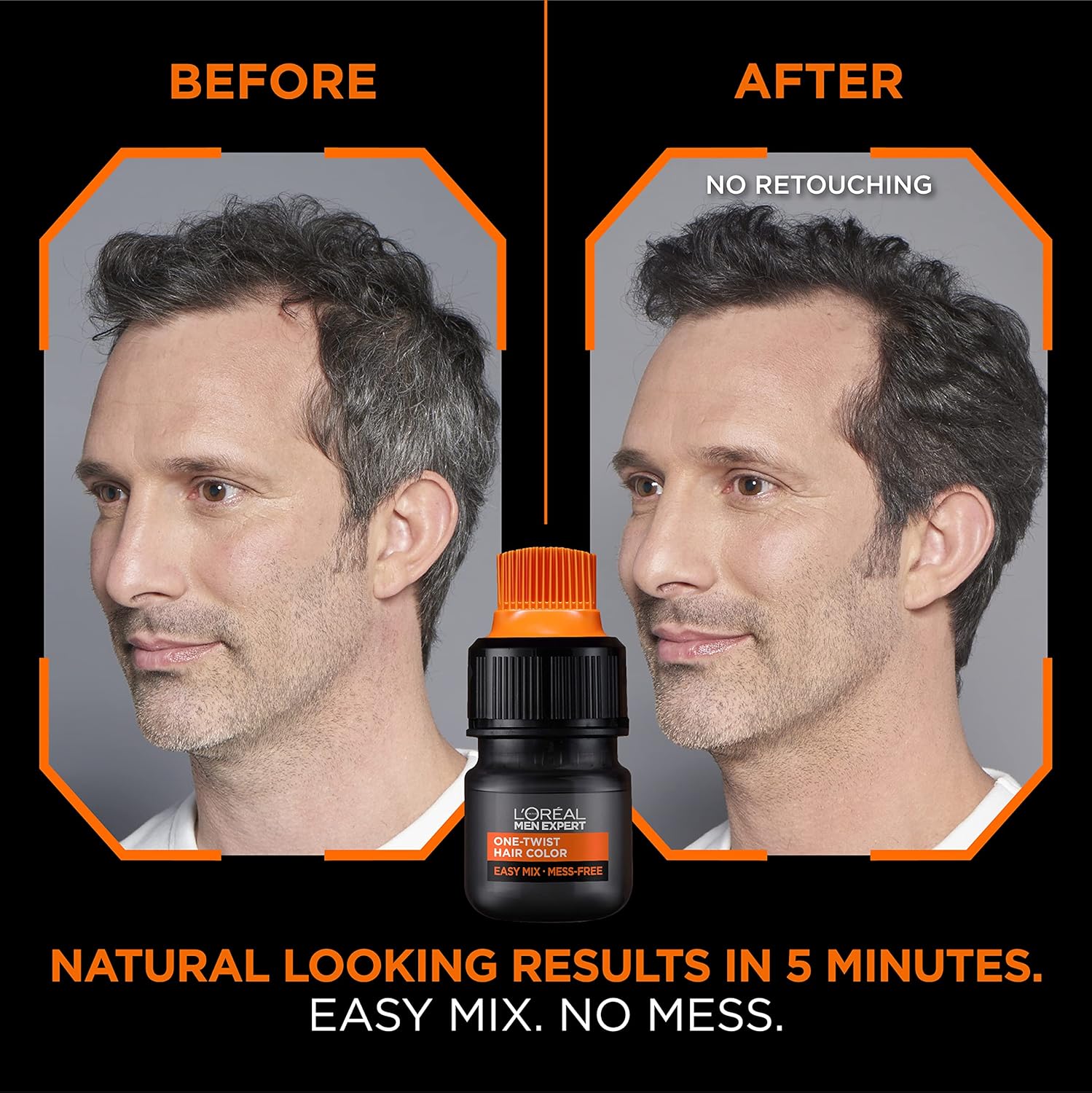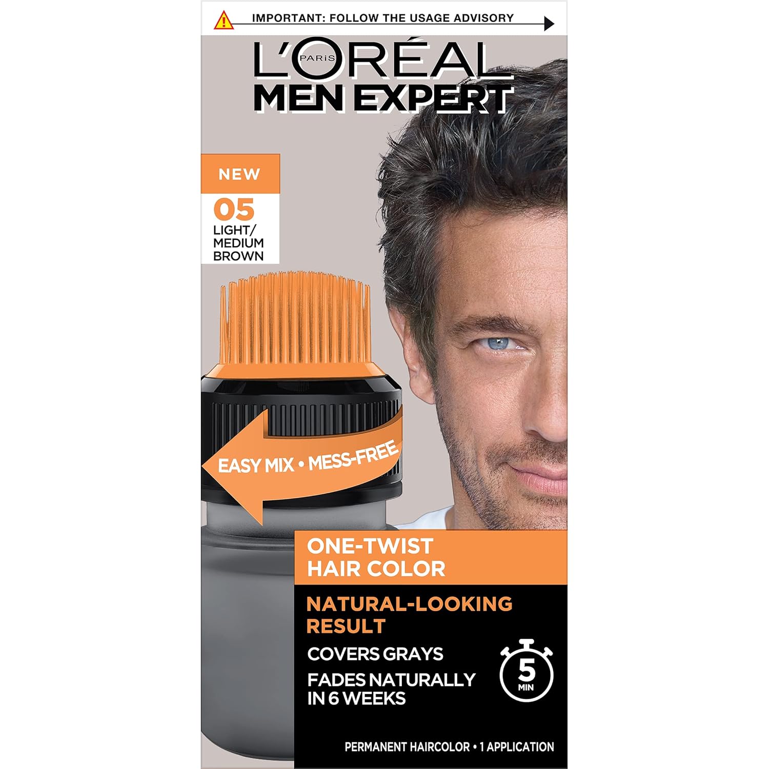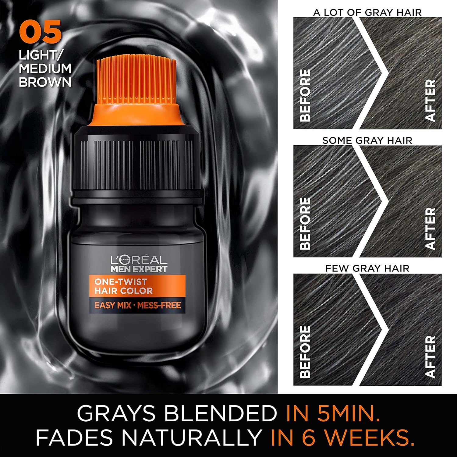 - Easy and Mess Free Application: Our L'Oreal Men Expert hair dye is delivered in a patented ONE TWIST applicator. Simply twist, shake, crack and apply. Blends grays with your original hair color and fades naturally in 6 weeks