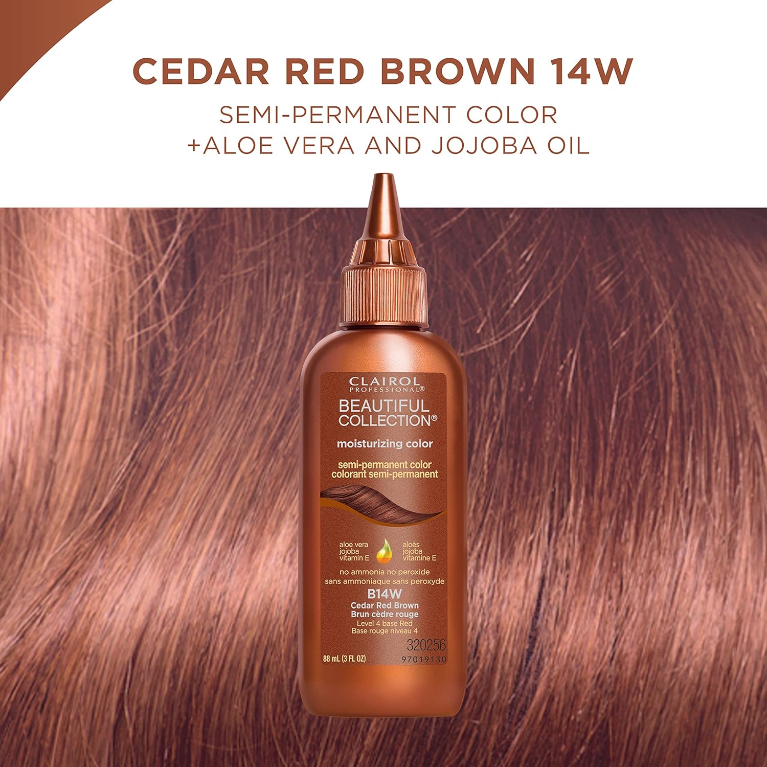 Achieve vibrant, salon-quality color with Clairol Professional Beautiful Collection Hair Color in 14W Cedar Red Brown. This semi-permanent hair color delivers rich, long-lasting results with an intense, deep red-brown hue that complements a variety of skin tones. Enriched with moisturizing ingredients, it nourishes and hydrates hair during the coloring process, leaving it soft and shiny. Ideal for anyone looking to enhance their natural color or experiment with a new, bold shade, this 3-ounce formula ensures even coverage, perfect for touch-ups or full-color transformations. Enjoy beautiful, radiant color that lasts with Clairol Professional Beautiful Collection.